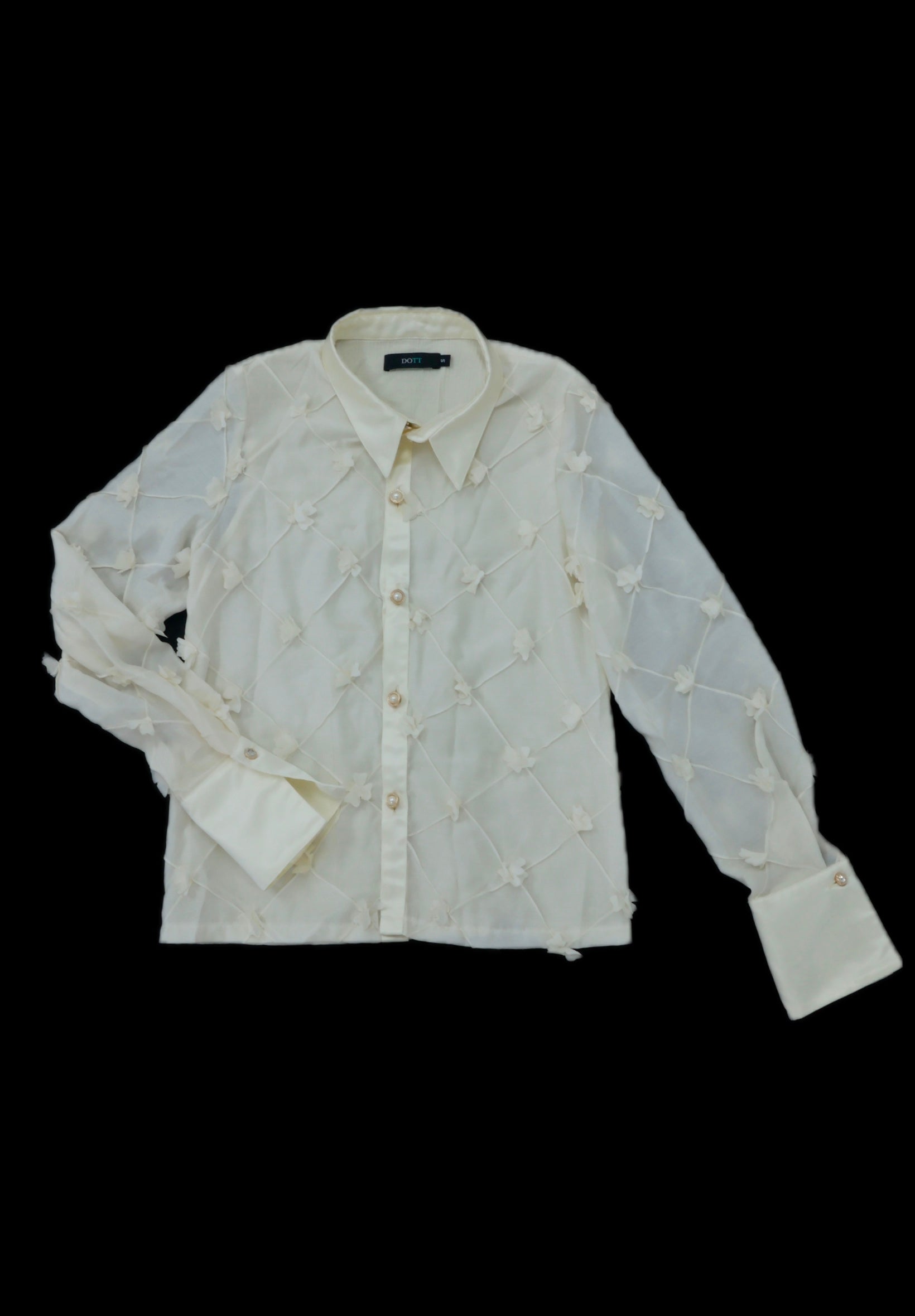 Introducing Bloomin Top, this is a sheer white blouse crafted from lightweight fabric, featuring a grid-like design adorned with 3D floral appliqués for a soft, romantic texture. Finished with pearl-style buttons and a classic collar, it’s a dreamy piece that blends femininity with elegance — perfect for layering or as a statement on its own.