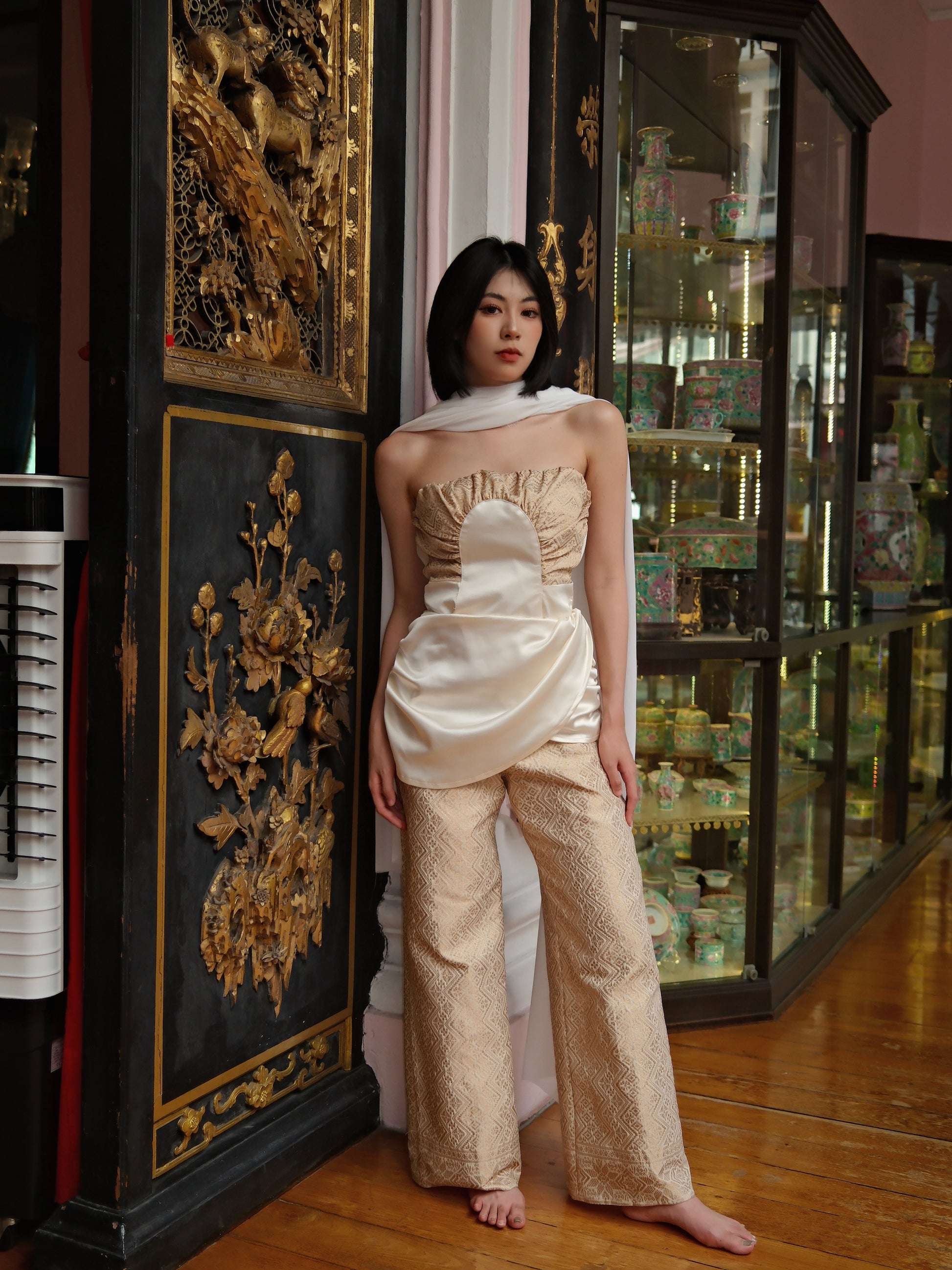 Introducing Pearl Reverie(comes with both TOP+BOTTOM),is a modern interpretation of traditional Southeast Asian attire, blending luxurious fabrics with contemporary design elements. The ensemble features a structured, ruched strapless top with a draped satin overlay, creating a regal yet modern silhouette. Paired with intricately patterned wide-leg trousers, the look exudes sophistication while maintaining cultural heritage through the fabric choice and design details. This outfit is perfect for formal occasions, cultural events, or as a statement piece that merges tradition with modern fashion sensibilities.
