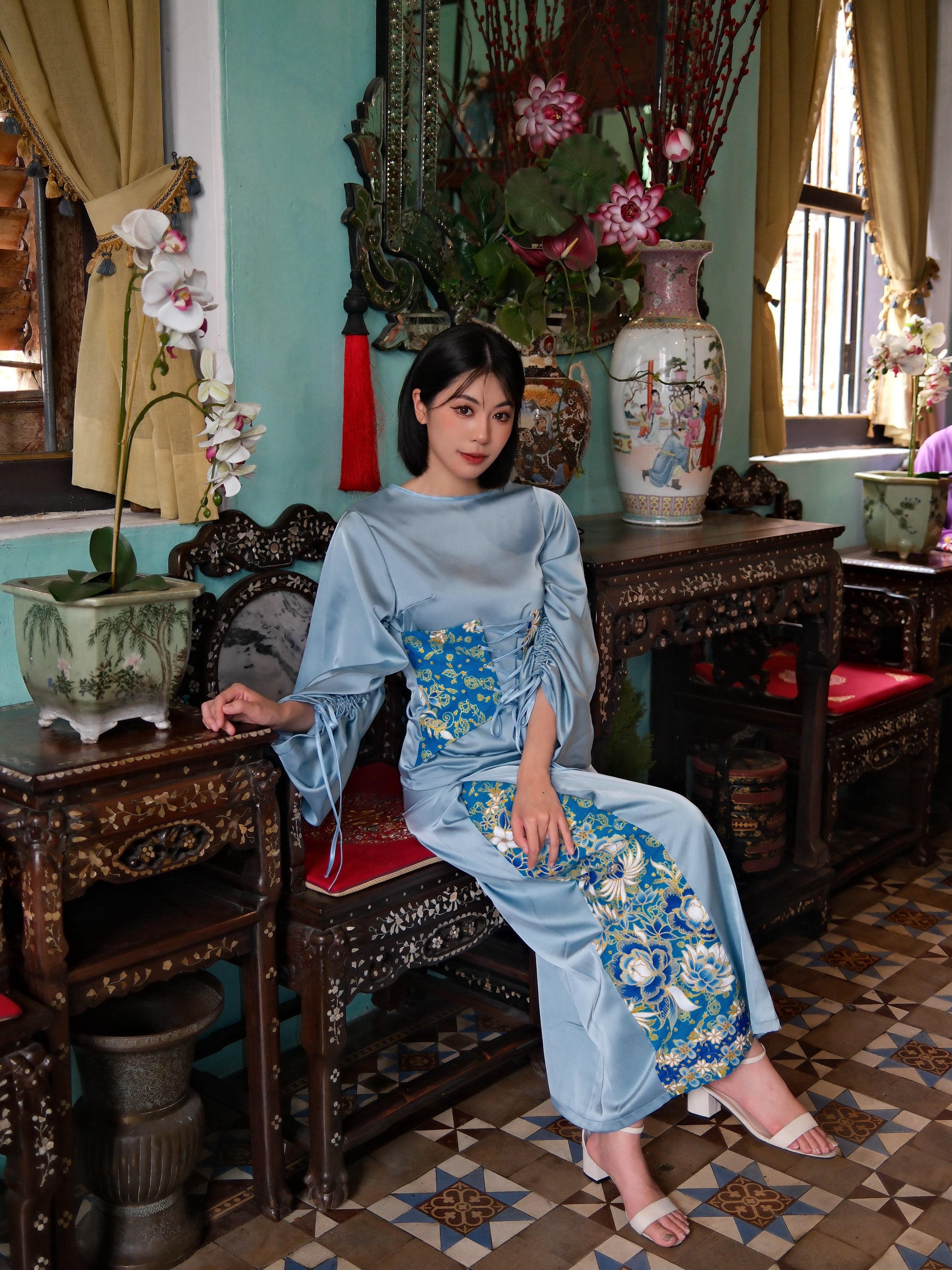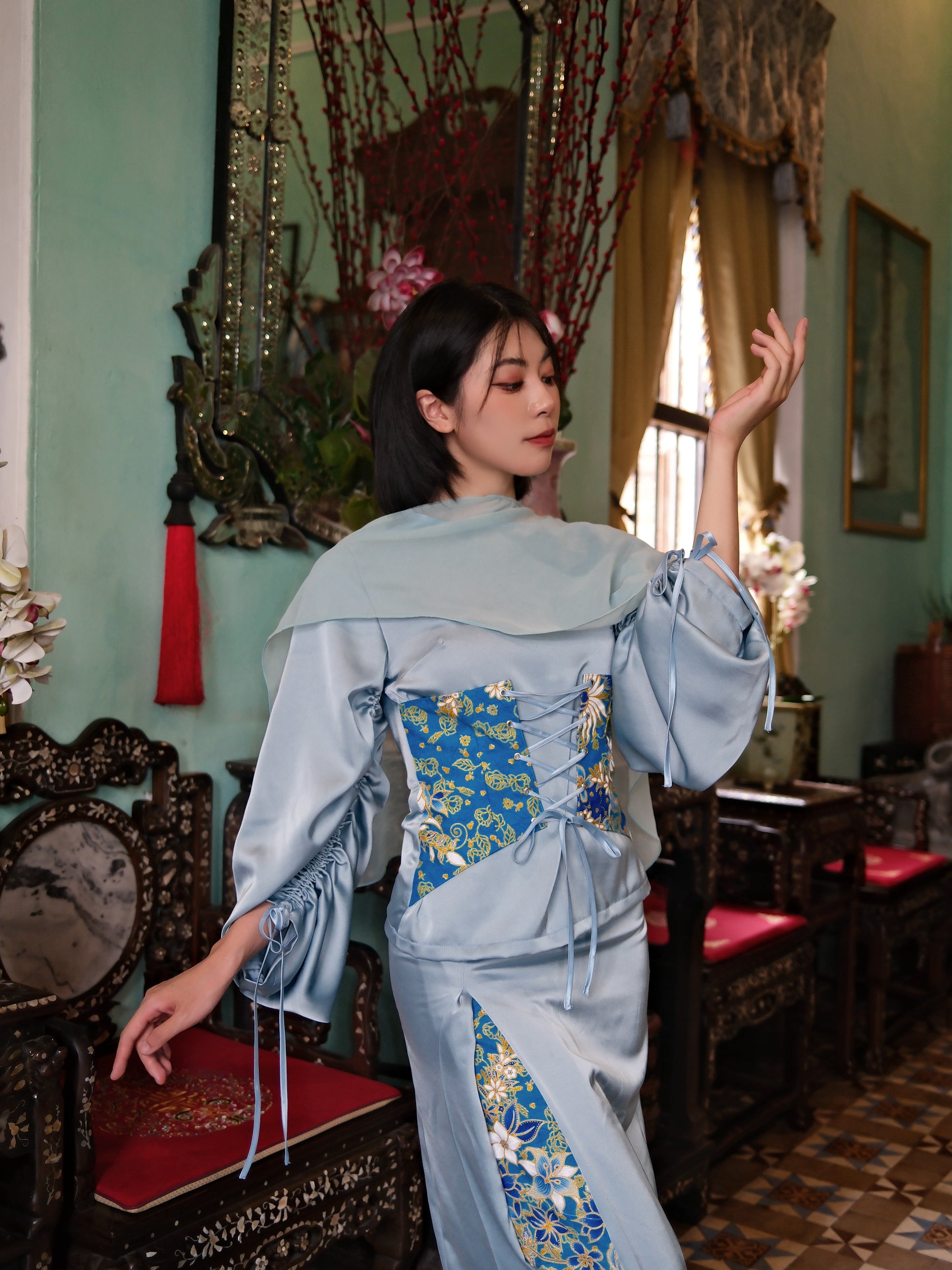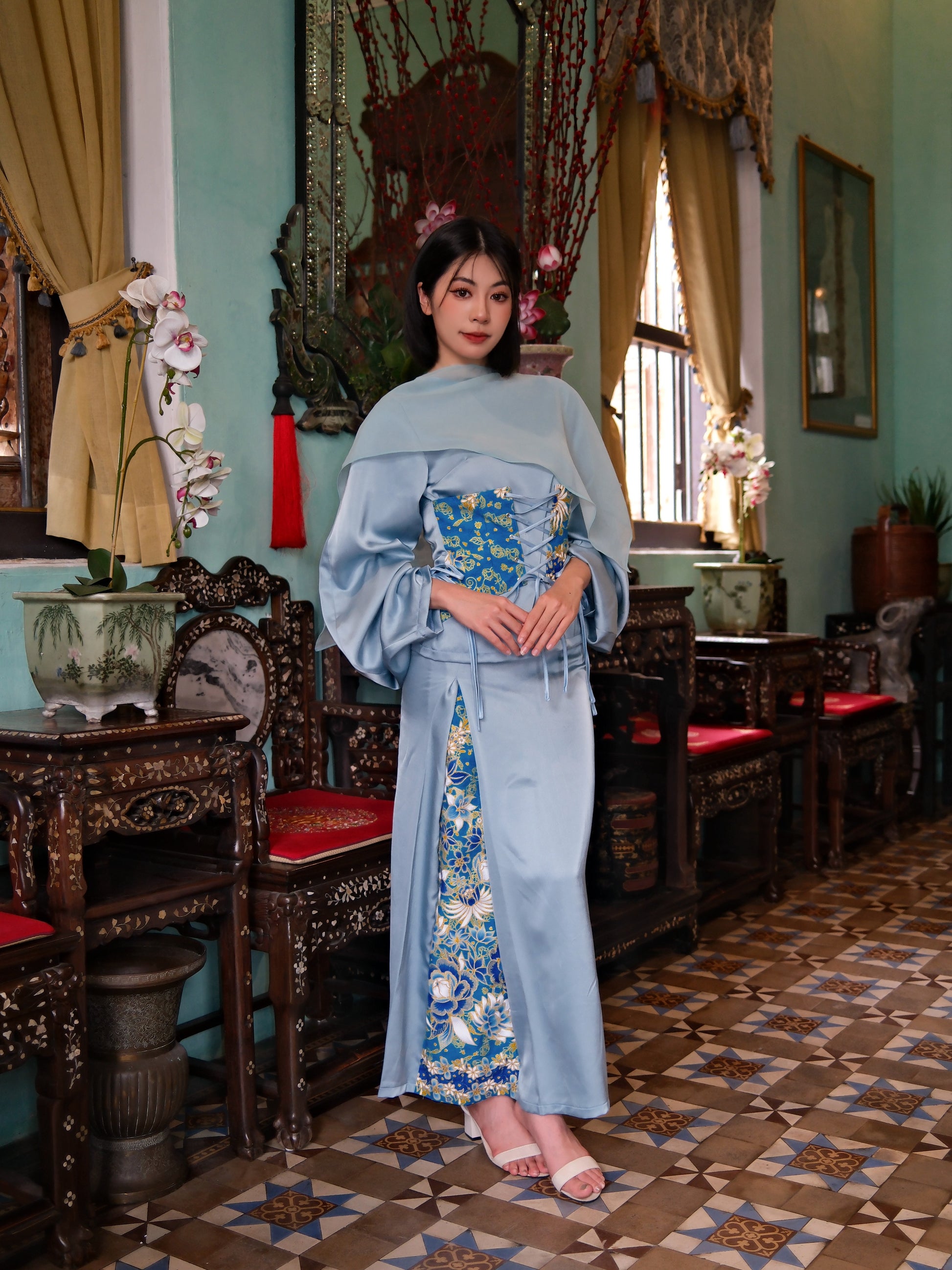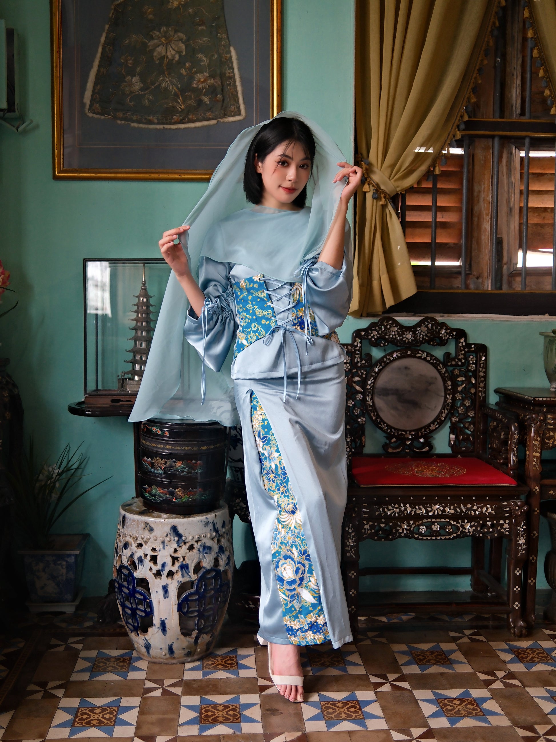 Introducing Serenity Luxe(comes with both TOP+BOTTOM),is a stunning fusion of traditional and modern design, featuring a soft blue satin gown with intricate floral batik. The dress is accentuated by a structured corset with lace-up detailing, adding a touch of femininity and vintage charm. Flowing bishop sleeves enhance the regal aesthetic, while the matching sheer shawl draped over the shoulders adds an element of grace. The subtle slit in the skirt, revealing a beautifully patterned fabric panel, brings depth and sophistication to the look. Perfect for cultural events, formal occasions, or as a statement piece, this outfit exudes timeless elegance with a contemporary twist.