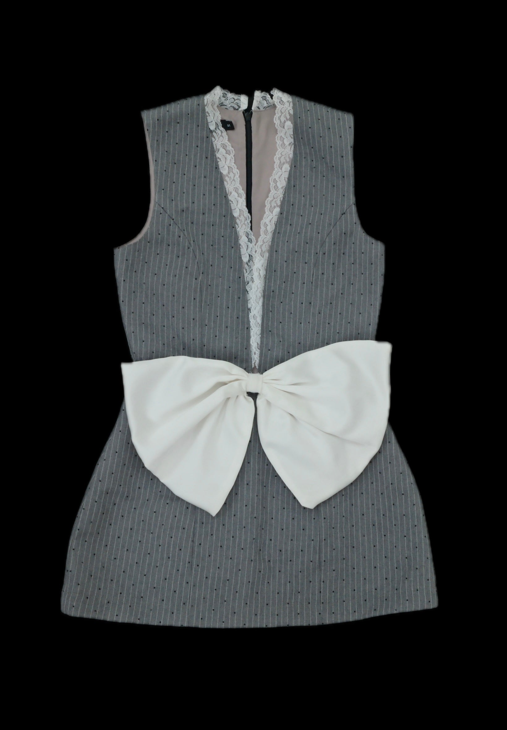 Introducing Valentina Dress , This sophisticated sleeveless dress is a bold fusion of classic tailoring and feminine charm. Crafted in a sleek grey pinstripe fabric adorned with subtle dotted detailing, it features a deep V-neckline trimmed with delicate white lace, adding a soft romantic contrast to its structured silhouette. The centerpiece of the design is an oversized white bow at the waist, dramatically cinching the figure and creating a statement look that exudes both elegance and flair. With its flattering cut and playful yet polished details, this dress is perfect for occasions where style and confidence are a must.The inner layer features a soft, nude-toned fabric that offers a smooth contrast beneath the dress’s deep neckline. Trimmed with elegant white lace along the edges, it adds a touch of vintage sophistication while maintaining a modern, refined look. This subtle yet stylish inner piece enhances the overall outfit by offering both modesty and an extra layer of texture, making the ensemble suitable for both daytime chic and evening elegance.It comes with a small detachable cute bow, wear it when u want it!