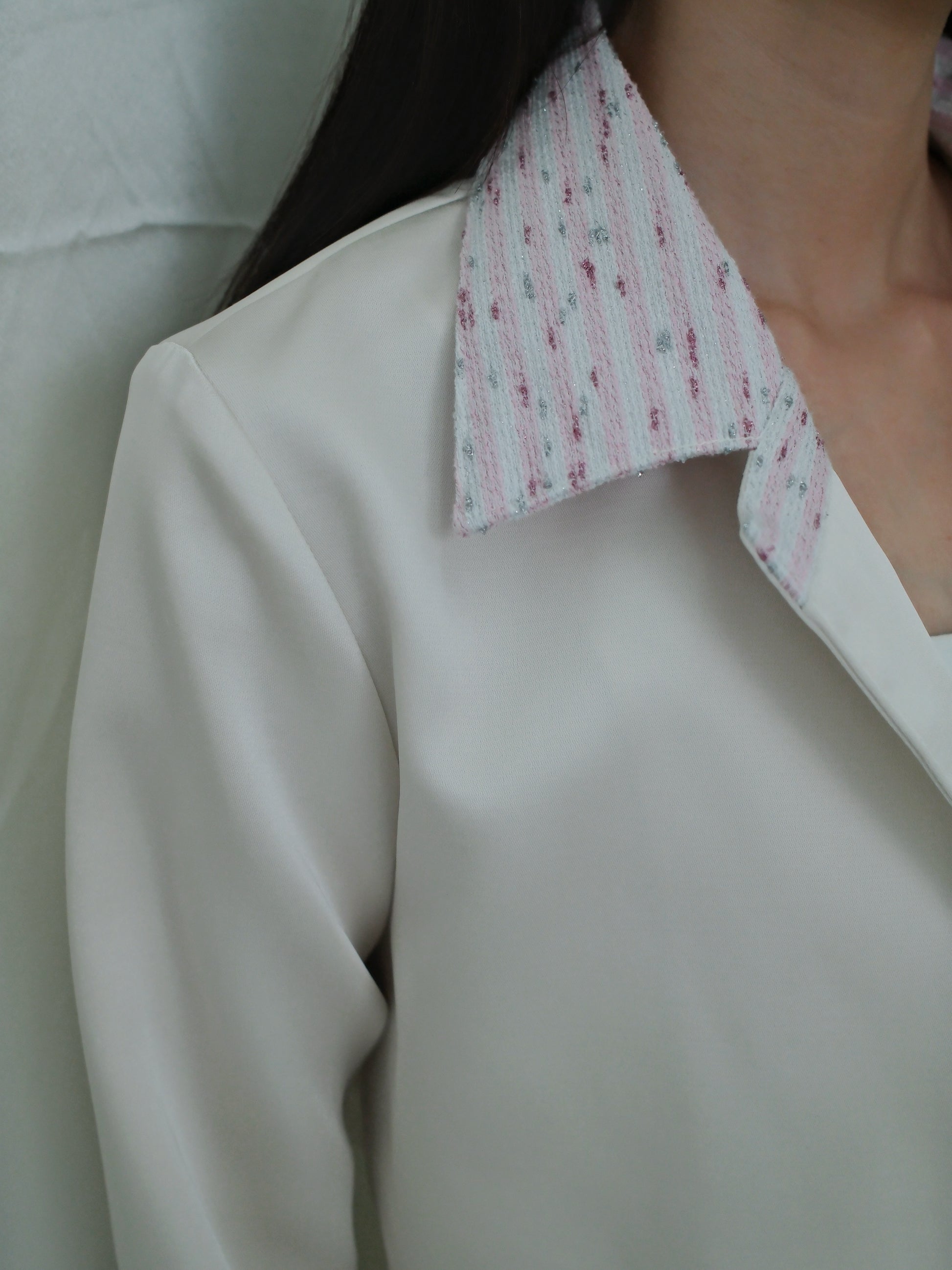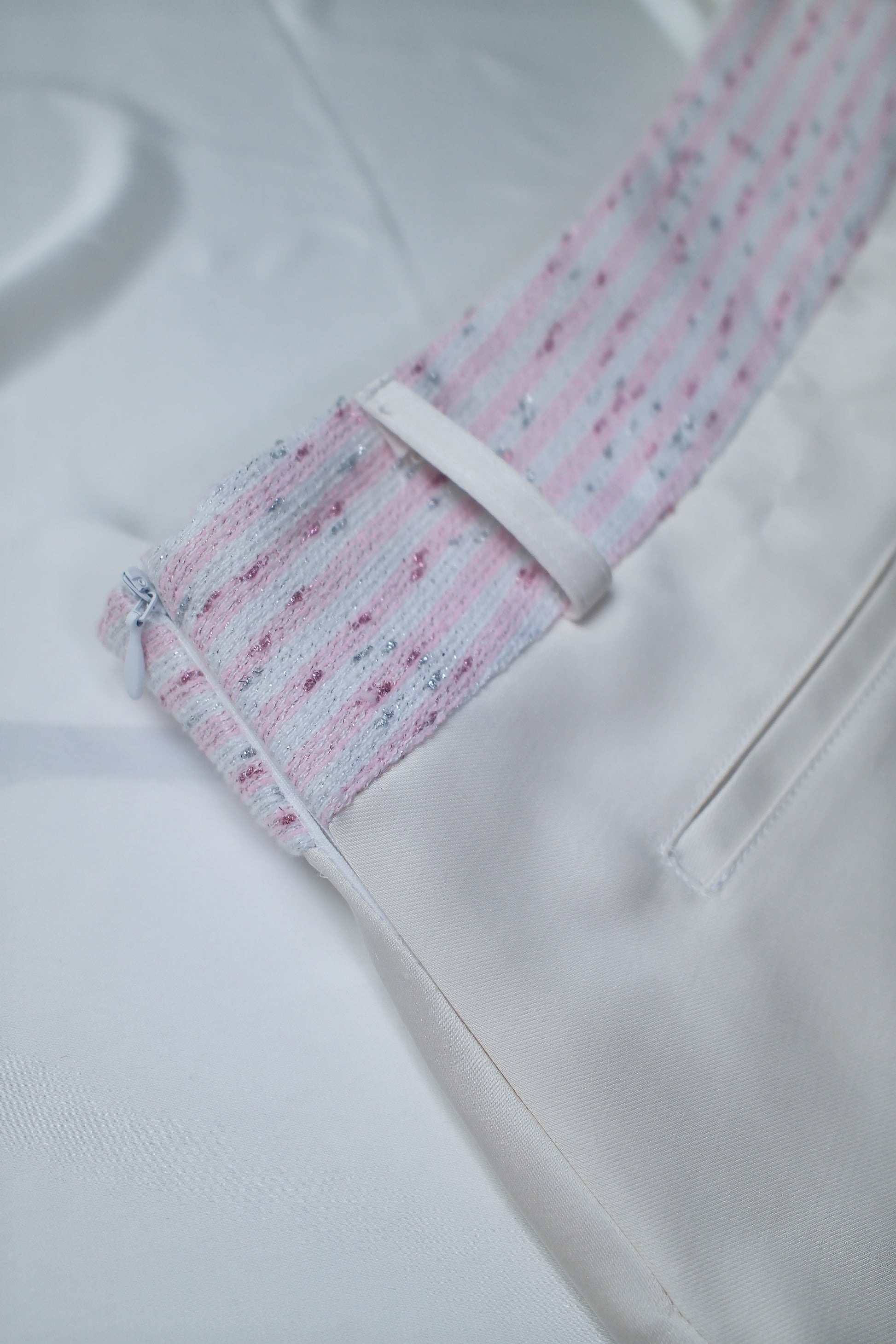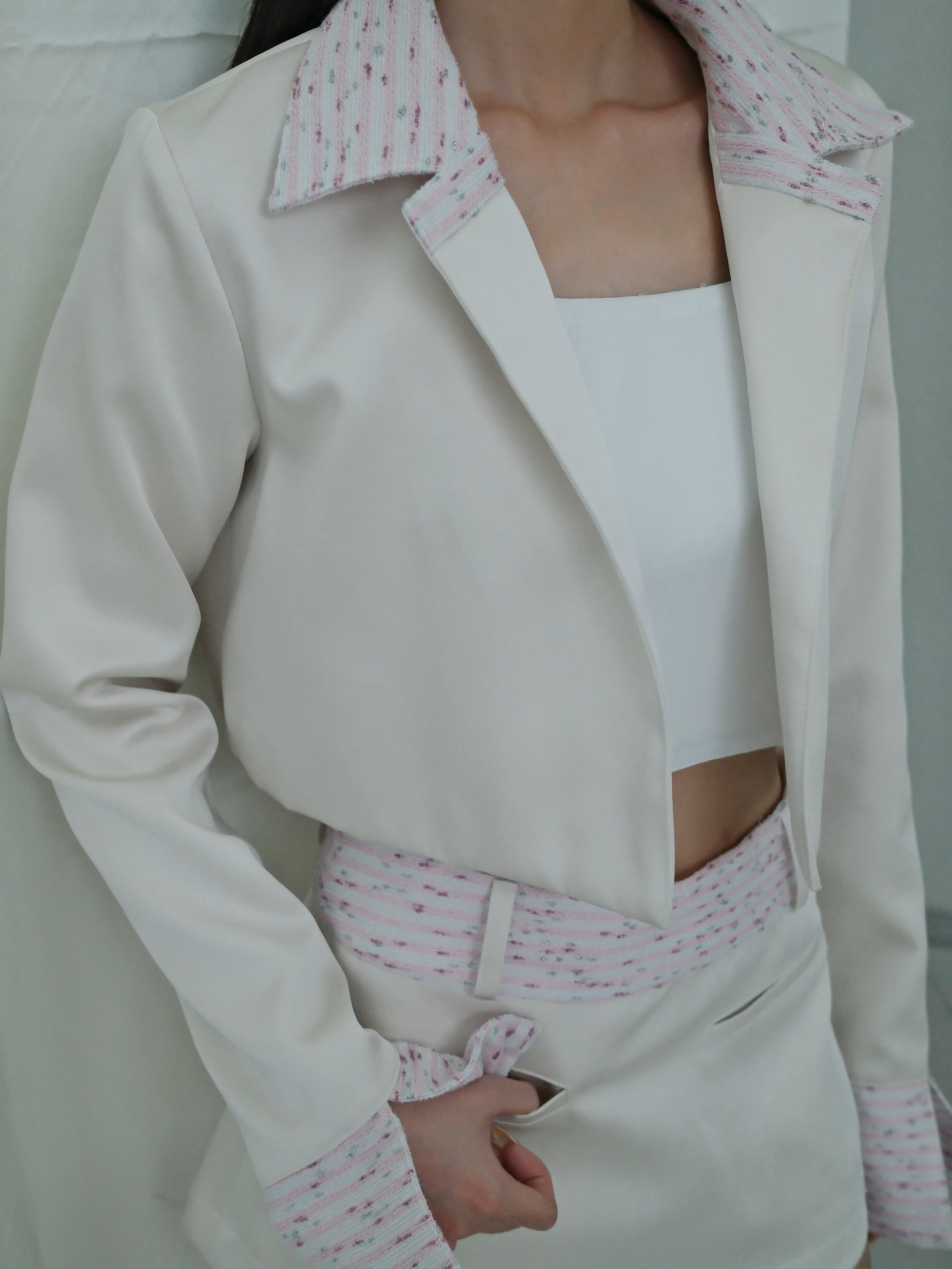 Introducing Vienna Set ,elevate your wardrobe with this couture-inspired set, where timeless tailoring meets refined femininity. The structured cropped blazer, featuring subtle textural contrasts in soft tweed along the collar and cuffs, exudes elegance with every detail. Paired with a sleek mini skort that highlights a statement waistband in matching pastel tweed, this ensemble blends power dressing with delicate charm. Meticulously crafted with a smooth, high-end fabric that drapes effortlessly, this set is the epitome of modern luxury — designed for the woman who commands attention with quiet confidence and impeccable style.